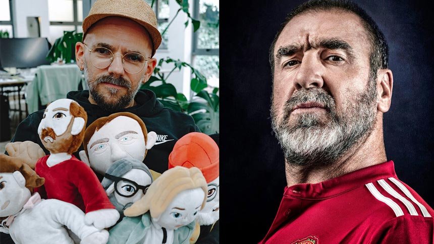 Eric Cantona em sua nova fase como artista, ao lado de criador de bonecos artísticos